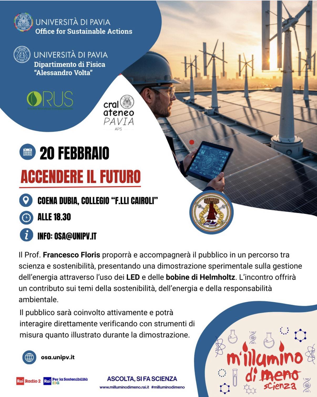 Durante l’evento il prof. Francesco Floris (Dipartimento di Fisica “Alessandro Volta”) guiderà i partecipanti in un percorso tra scienza e sostenibilità, con una dimostrazione sperimentale interattiva sulla gestione dell’energia attraverso l’uso di LED e bobine di Helmholtz